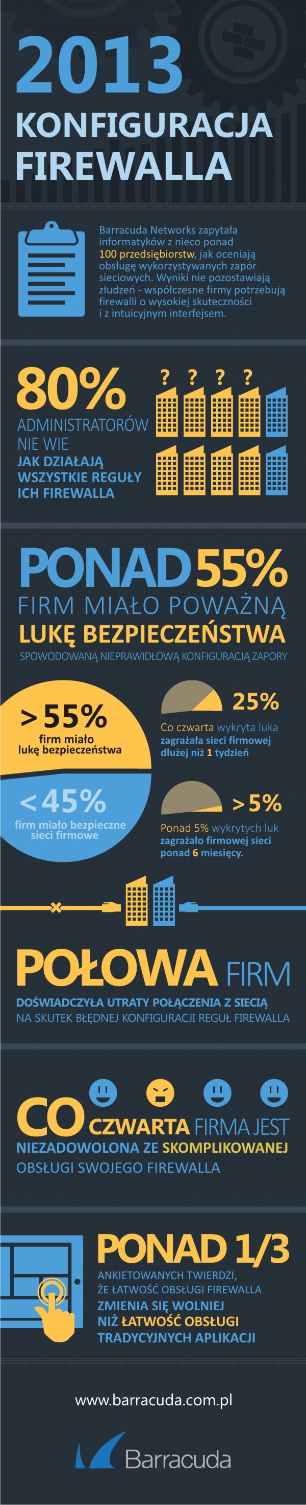 Firma Barracuda Networks, specjalizująca się w rozwiązaniach do ochrony sieci firmowych, prześwietliła ponad 100 organizacji, sprawdzając czy są zadowolone ze swoich zapór sieciowych. Aż czterech na pięciu pytanych administratorów zgłosiło problemy z obsługą firmowego firewalla, a w ponad połowie przedsiębiorstw zapora miała lukę wpływającą na bezpieczeństwo chronionej sieci. Z kolei w co drugiej badanej firmie błędna konfiguracja firewalla doprowadziła do utraty połączenia sieci.
