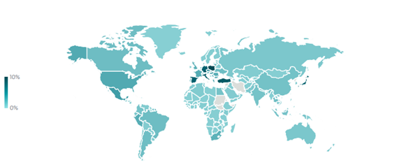 Mapa przedstawia kraje, w których zanotowano najwięcej ataków za pomocą downloader’ów