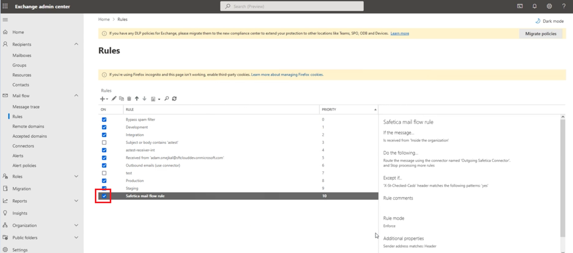 Teraz musisz skonfigurować reguły przepływu poczty w Exchange Online dla wiadomości e-mail, które mają być przekazywane na serwer Safetica.