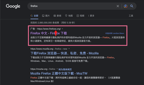 Screen przedstawiający fałszywą stronę w wynikach dot. Firefoxa w chińskiej wersji wyszukiwarki (fałszywa domena to www.firefoxs.org)