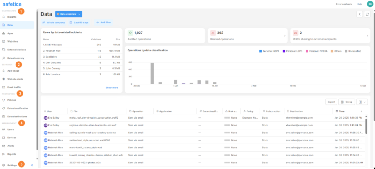 Safetica 11 oferuje scentralizowaną i przyjazną dla użytkownika konsolę do zarządzania bezpieczeństwem danych. Narzędzie te nie tylko optymalizuje analizę danych, ale także umożliwia tworzenie polityk ochrony oraz upraszcza zarządzanie użytkownikami i miejscami docelowymi danych. Dzięki intuicyjnemu interfejsowi, nawigacja i zarządzanie danymi stają się proste i efektywne. Przekonaj się jak Safetica 11 może uprościć zarządzanie danymi w Twojej firmie.
